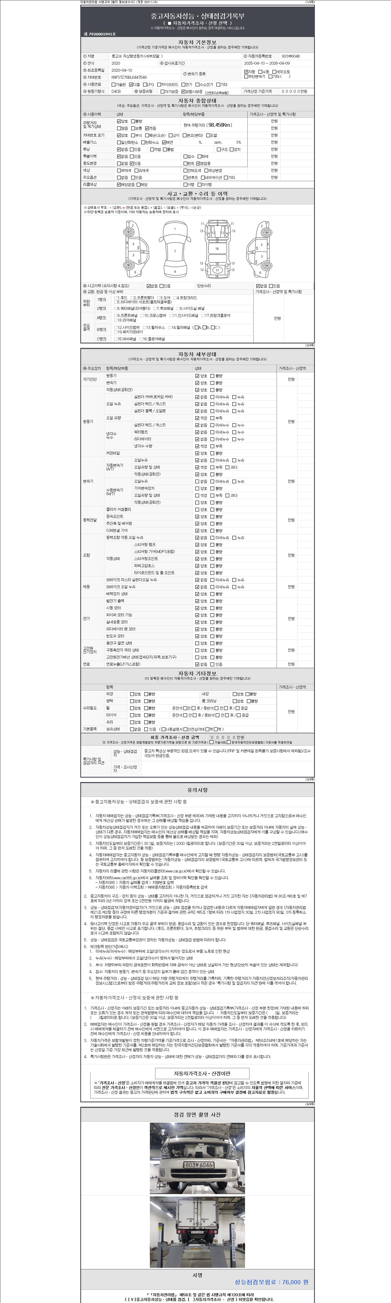 | 주행거리 | 98,438 km | 차량번호 | 803부6046 | 사고유무 | 성능기록부 참조 | 제시번호 | 제 2147483647 호 |