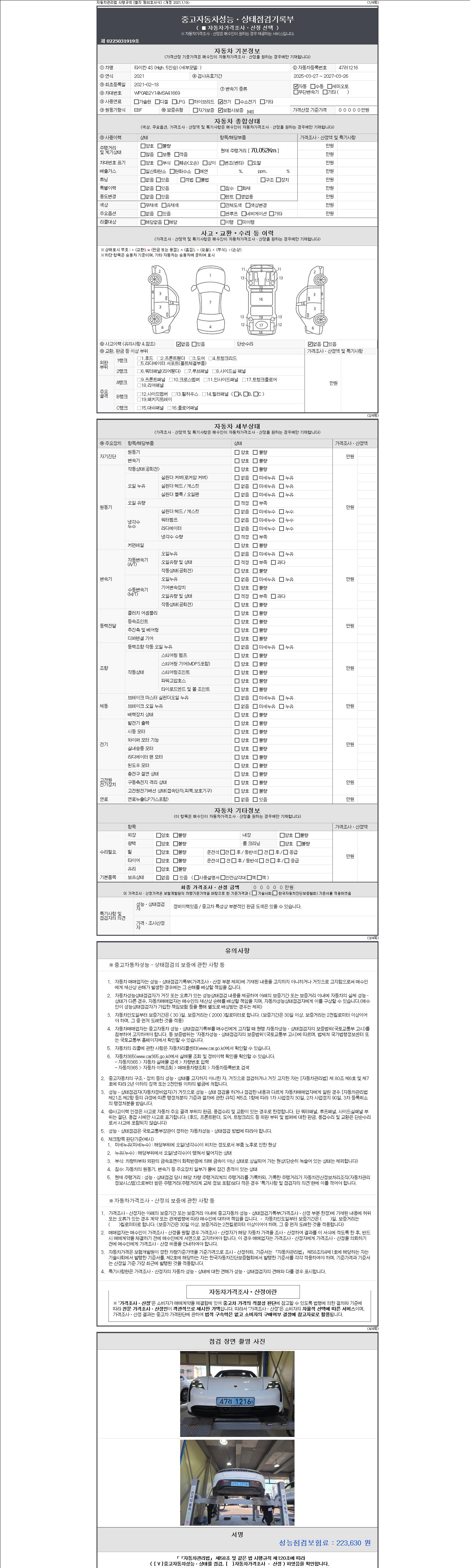 -중고자동차 매매업자를 통해 차량을 구입하실 경우 반드시 "중고자동차 성능, 상태점검 기록부"를 교뷰 받으셔야 하며, 매매업자는 반드시 의무 교부 하여야 압니다.