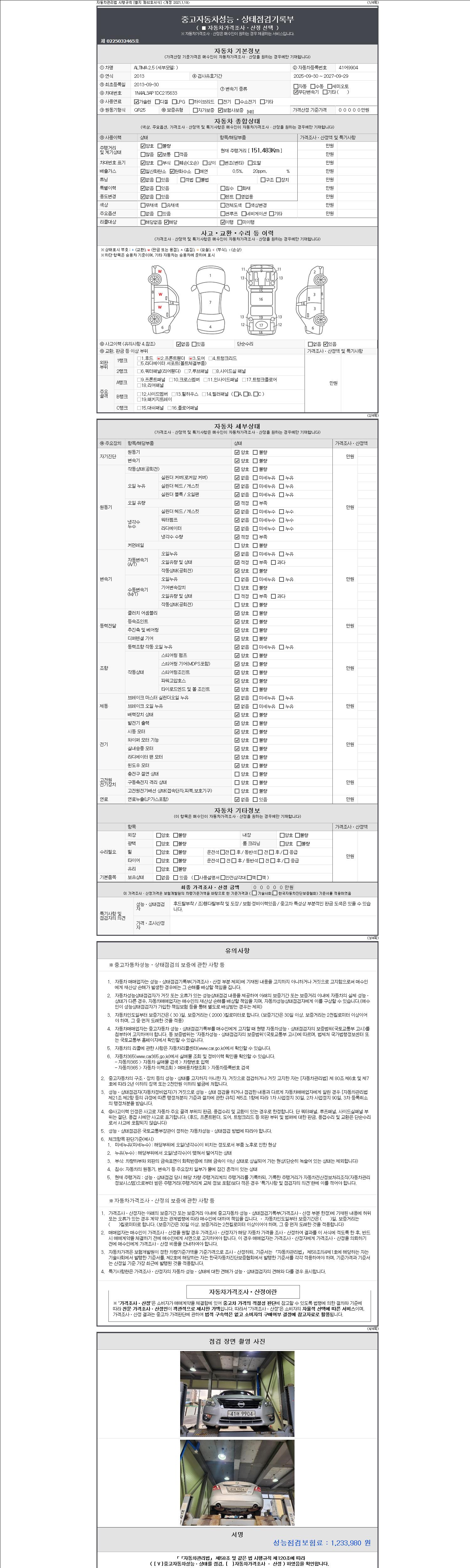 | 주행거리 | 151,483 km | 차량번호 | 41어9904 | 사고유무 | 성능기록부 참조 | 제시번호 | 제 2147483647 호 |