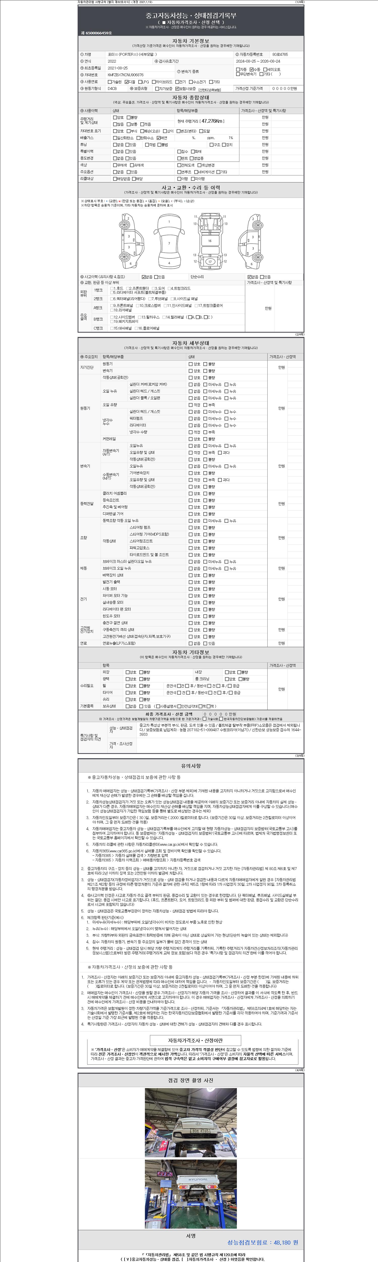 | 주행거리 | 47,276 km | 차량번호 | 80로4765 | 사고유무 | 성능기록부 참조 | 제시번호 | 제 2147483647 호 |