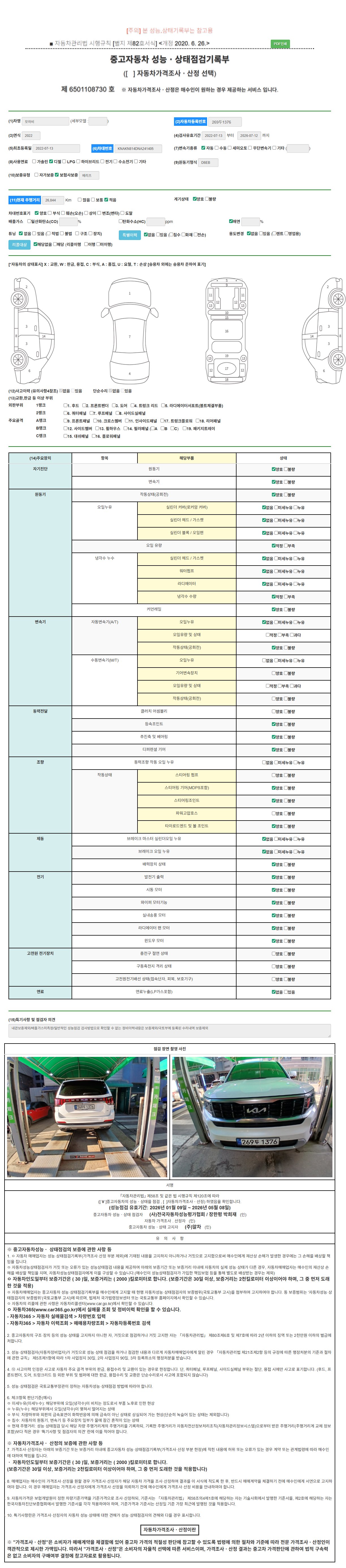 자동차관리법 시행규칙 제120조의 규정에 따라 별지 제 82호서식 《중고자동차 성능, 상태점검 기록부》를 발행한 성능, 상태점검자 및 매매자는 아래의 보증기간 또는 보증거리 이내의 중고자동차, 성능점검 기록부에 기재된 내용과 자동차의 실제 성능, 상태가 다른 경우 계약 또는 관계법령에 따라 매수인에 대하여 책임을 집니다.