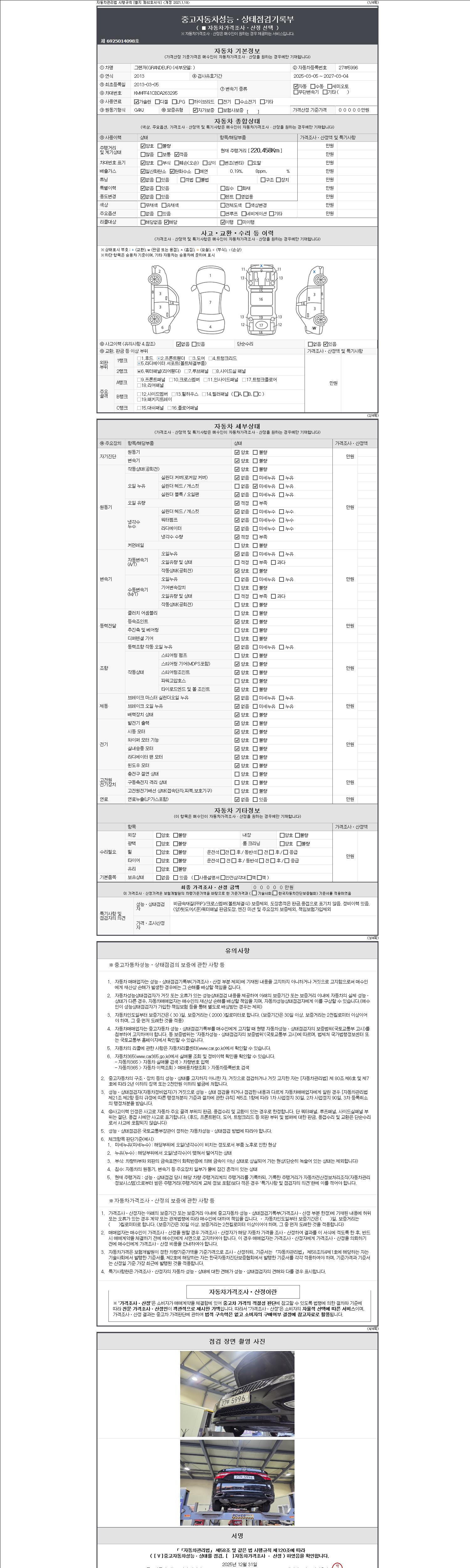 -중고자동차 매매업자를 통해 차량을 구입하실 경우 반드시 "중고자동차 성능, 상태점검 기록부"를 교뷰 받으셔야 하며, 매매업자는 반드시 의무 교부 하여야 압니다.