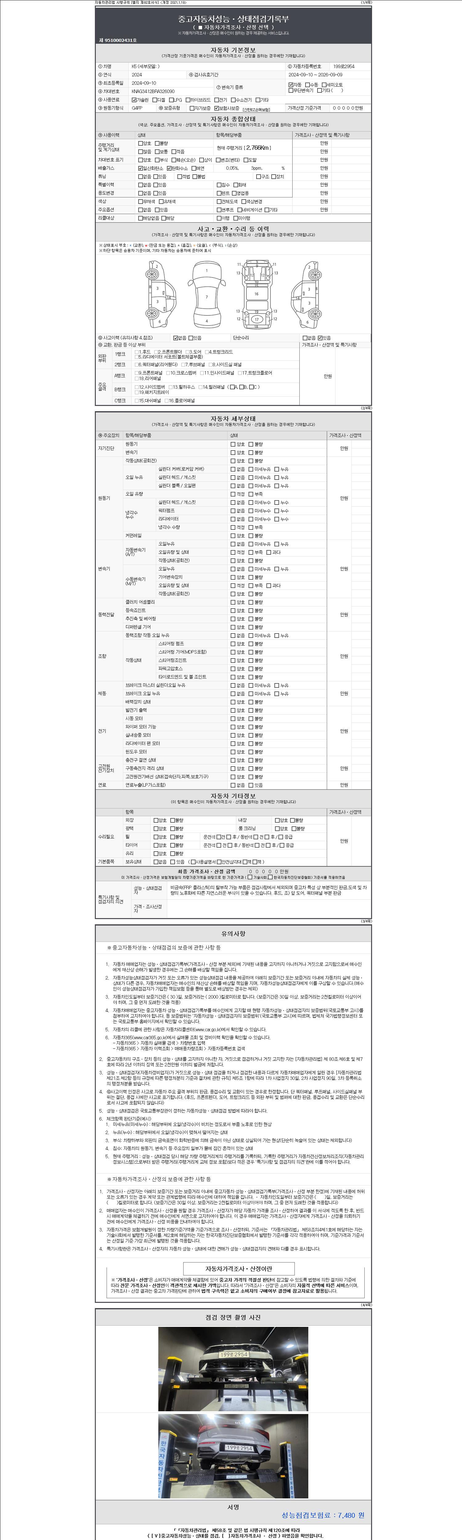 자동차관리법 시행규칙 제120조의 규정에 따라 별지 제 82호서식 《중고자동차 성능, 상태점검 기록부》를 발행한 성능, 상태점검자 및 매매자는 아래의 보증기간 또는 보증거리 이내의 중고자동차, 성능점검 기록부에 기재된 내용과 자동차의 실제 성능, 상태가 다른 경우 계약 또는 관계법령에 따라 매수인에 대하여 책임을 집니다.