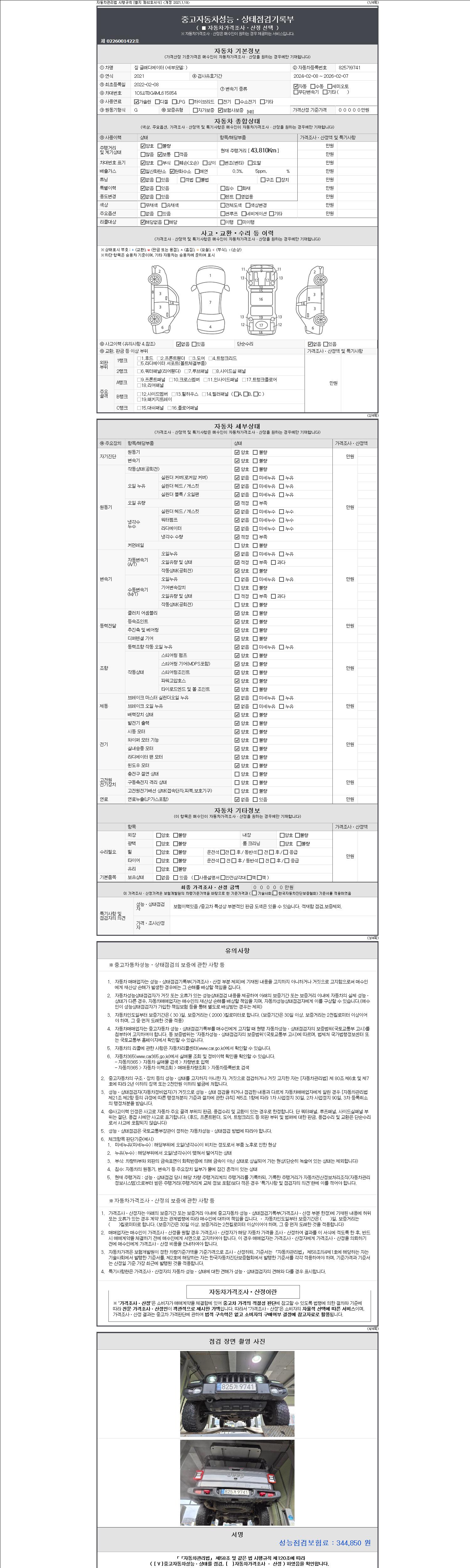 | 주행거리 | 43,810 km | 차량번호 | 825가9741 | 사고유무 | 성능기록부 참조 | 제시번호 | 제 2147483647 호 |