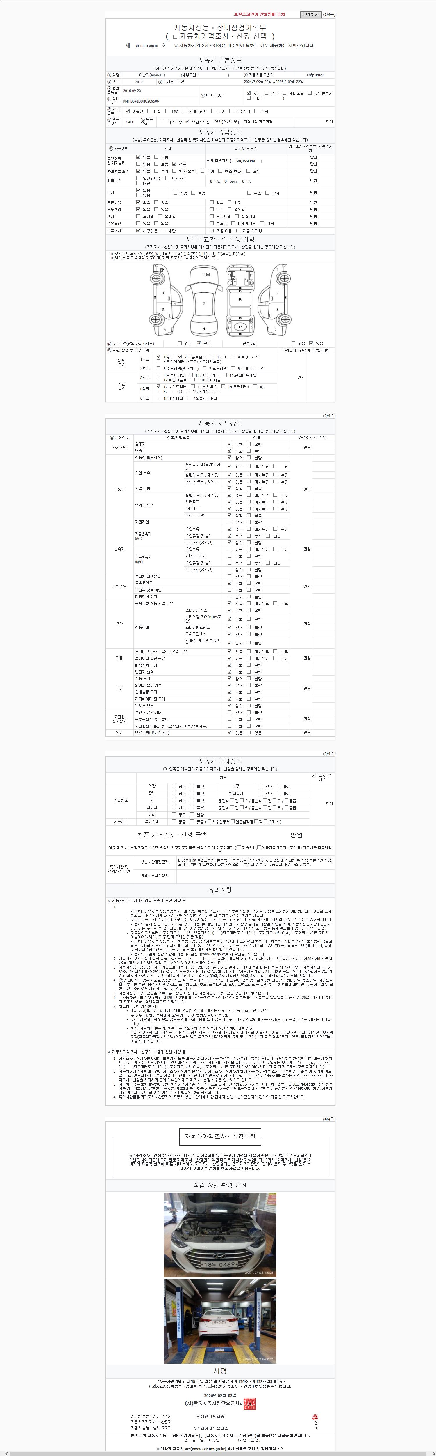 | 주행거리 | 98,199 km | 차량번호 | 18누0469 | 사고유무 | 성능기록부 참조 | 제시번호 | 제 2026011803 호 |