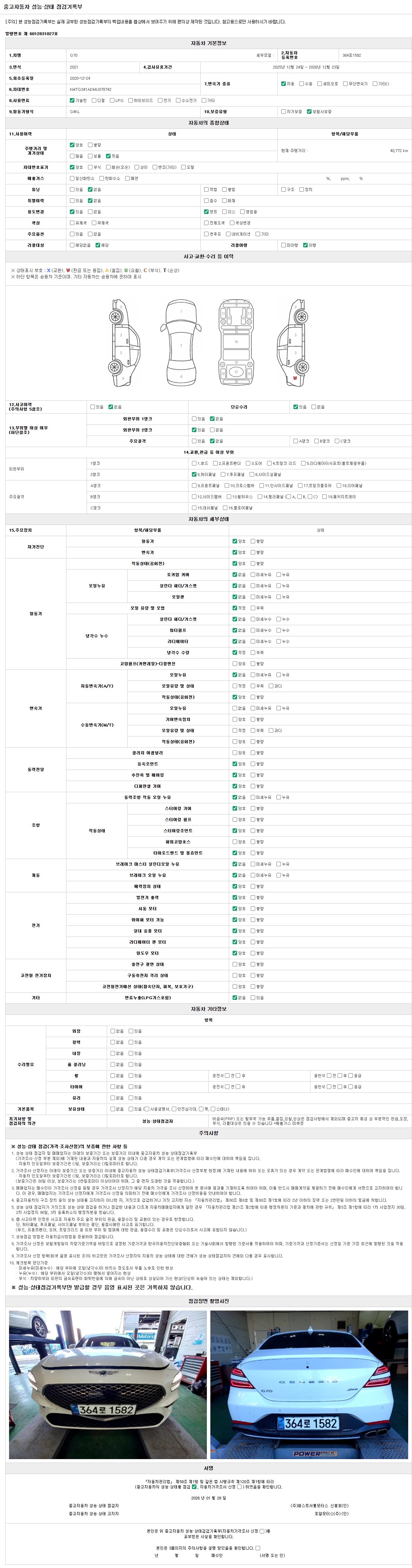 | 주행거리 | 40,772 km | 차량번호 | 364로1582 | 사고유무 | 성능기록부 참조 | 제시번호 | 제 2026003008 호 |