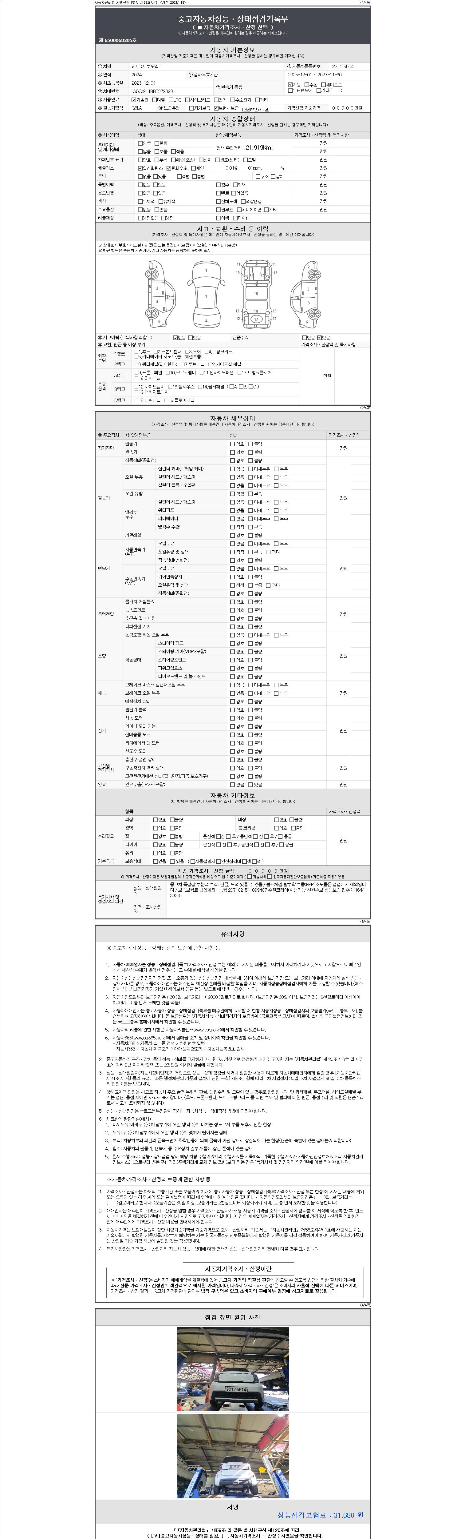 -중고자동차 매매업자를 통해 차량을 구입하실 경우 반드시 "중고자동차 성능, 상태점검 기록부"를 교뷰 받으셔야 하며, 매매업자는 반드시 의무 교부 하여야 압니다.
