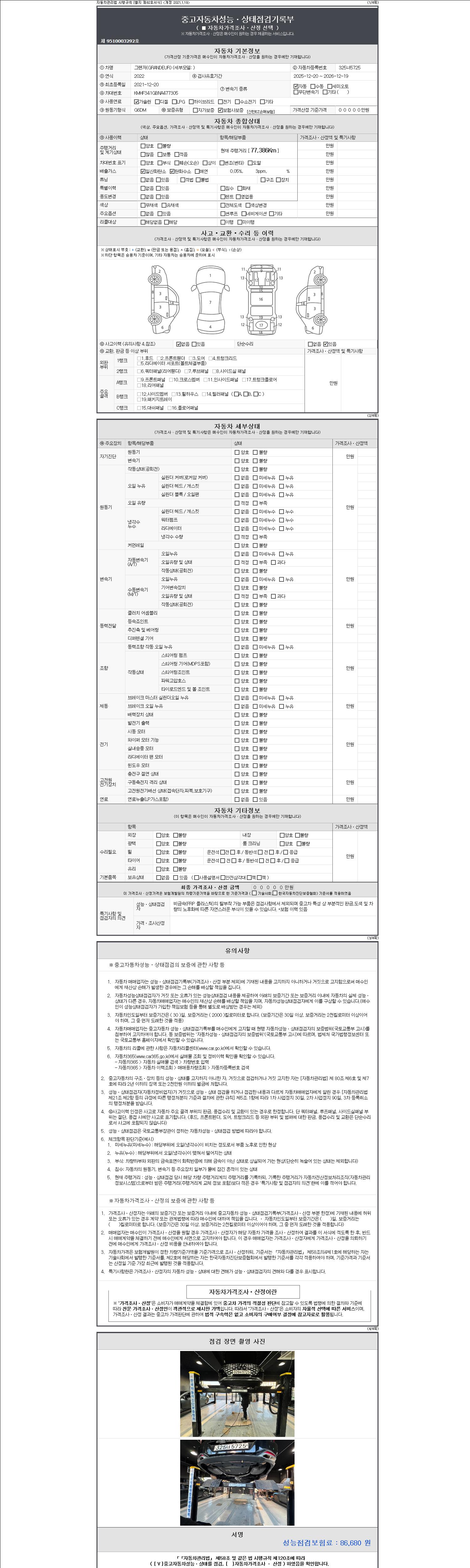 | 주행거리 | 77,386 km | 차량번호 | 325너5725 | 사고유무 | 성능기록부 참조 | 제시번호 | 제 2147483647 호 |