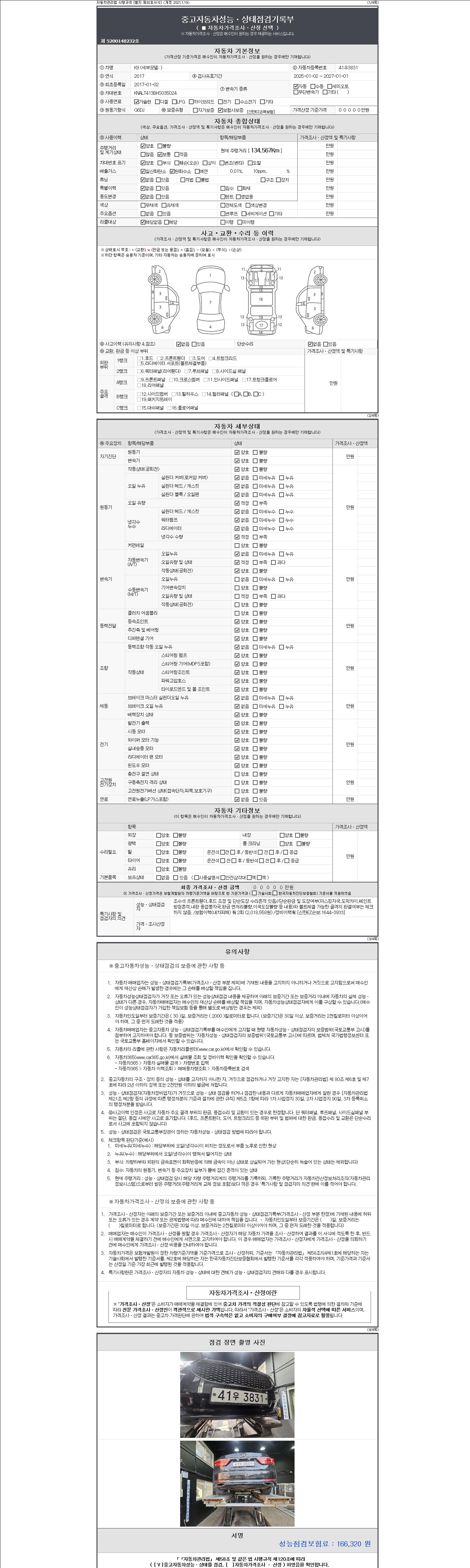 | 주행거리 | 134,567 km | 차량번호 | 41우3831 | 사고유무 | 성능기록부 참조 | 제시번호 | 제 2147483647 호 |