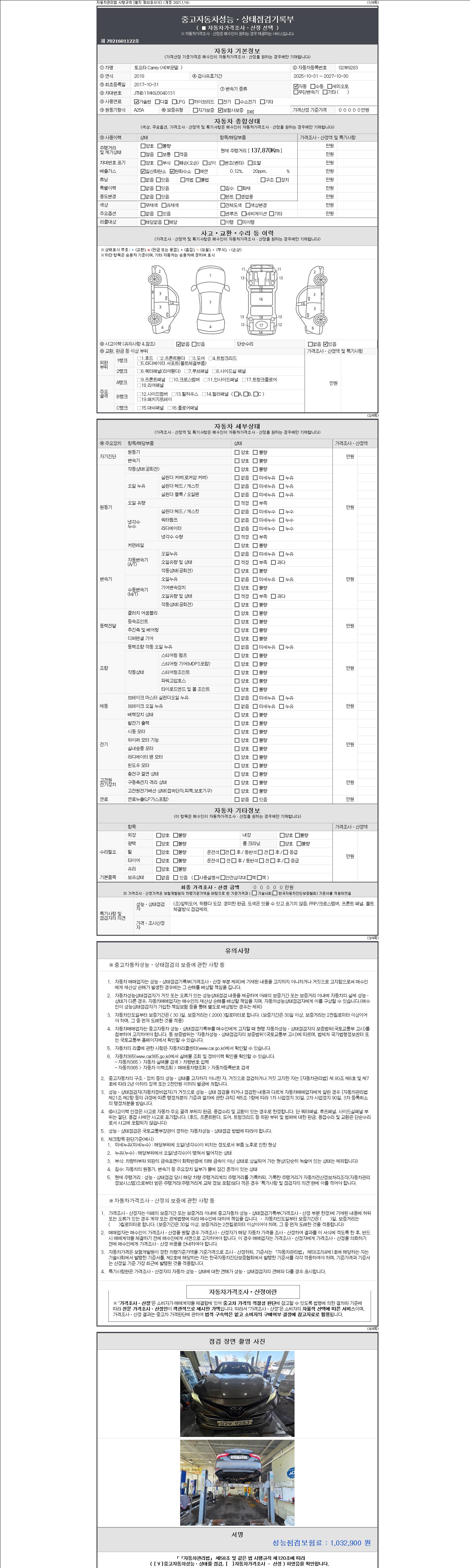 -중고자동차 매매업자를 통해 차량을 구입하실 경우 반드시 "중고자동차 성능, 상태점검 기록부"를 교뷰 받으셔야 하며, 매매업자는 반드시 의무 교부 하여야 압니다.