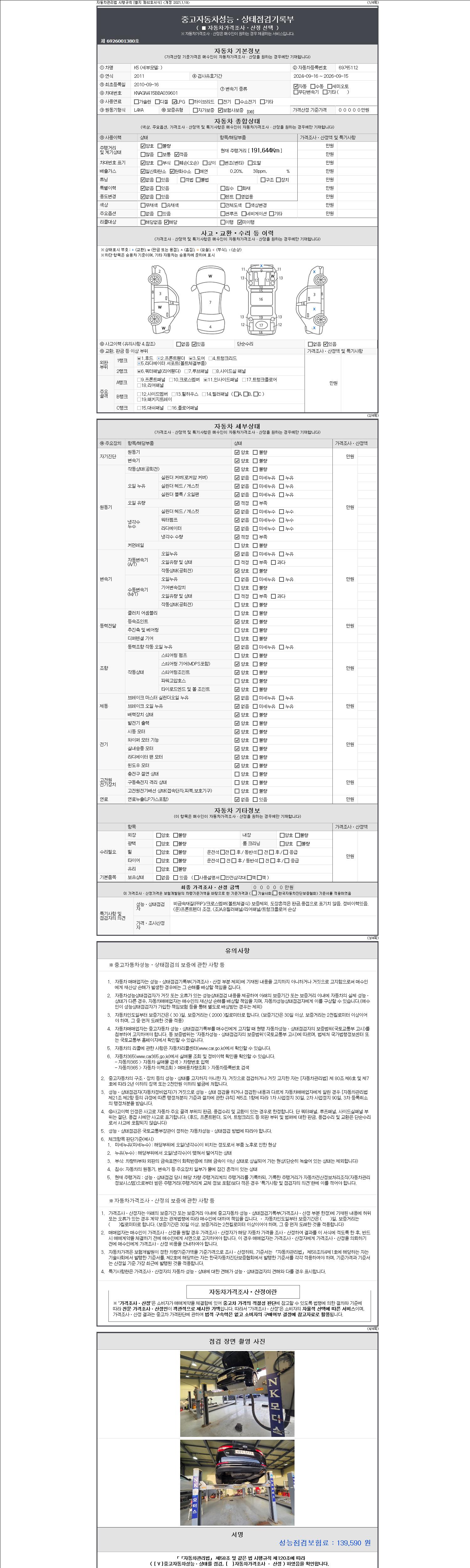| 주행거리 | 191,644 km | 차량번호 | 69거5112 | 사고유무 | 성능기록부 참조 | 제시번호 | 제 2147483647 호 |