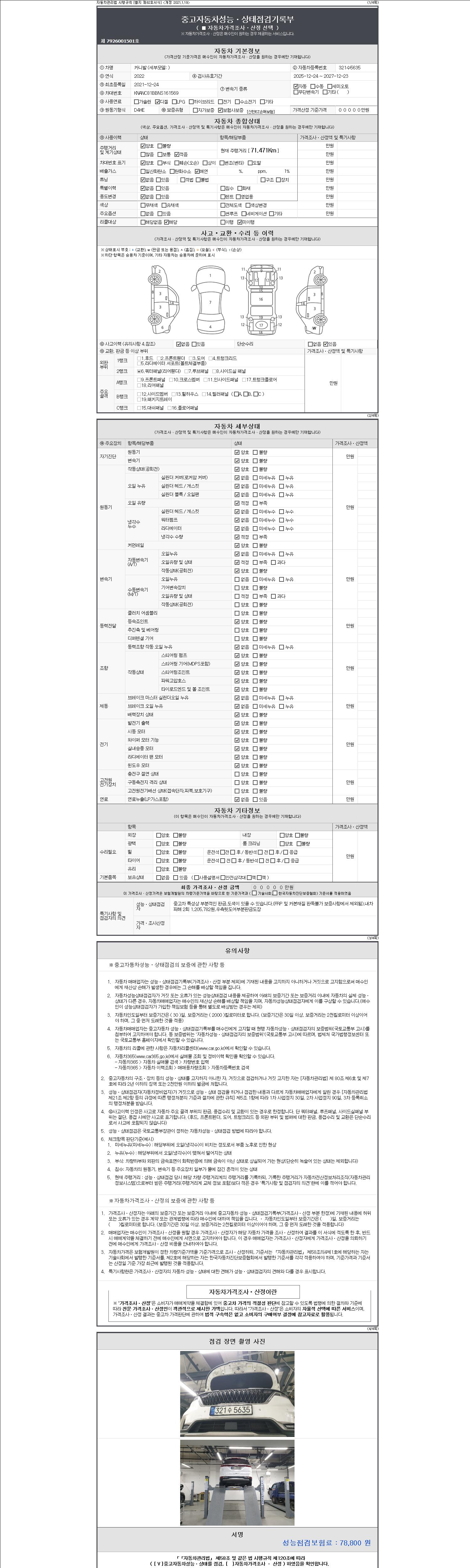| 주행거리 | 71,471 km | 차량번호 | 321수5635 | 사고유무 | 성능기록부 참조 | 제시번호 | 제 2147483647 호 |