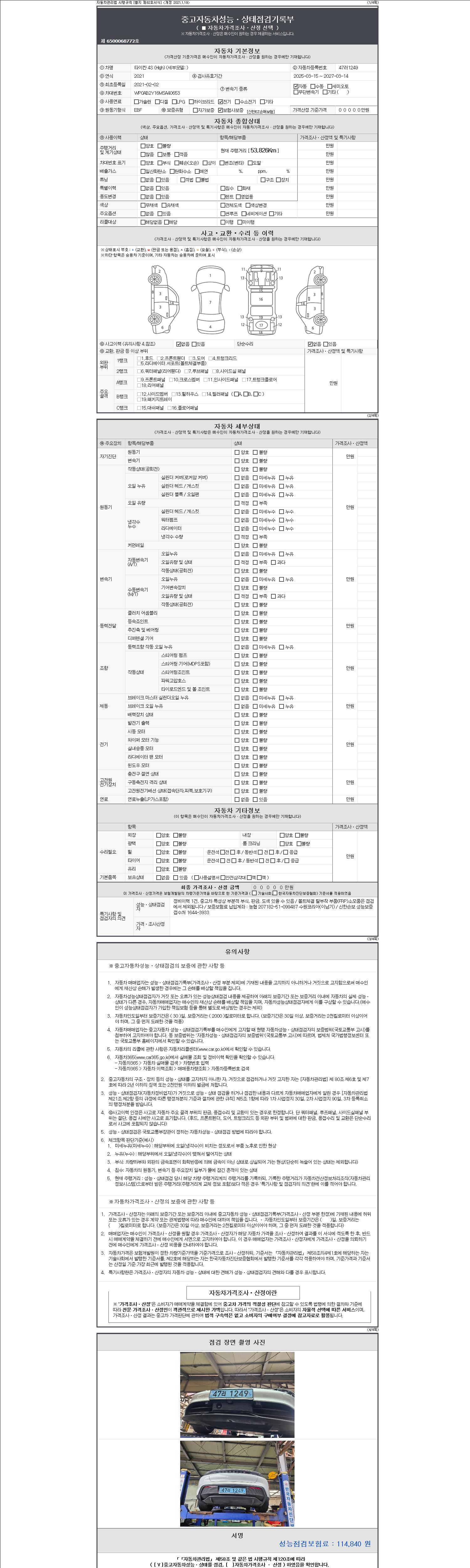 | 주행거리 | 53,826 km | 차량번호 | 47러1249 | 사고유무 | 성능기록부 참조 | 제시번호 | 제 2147483647 호 |