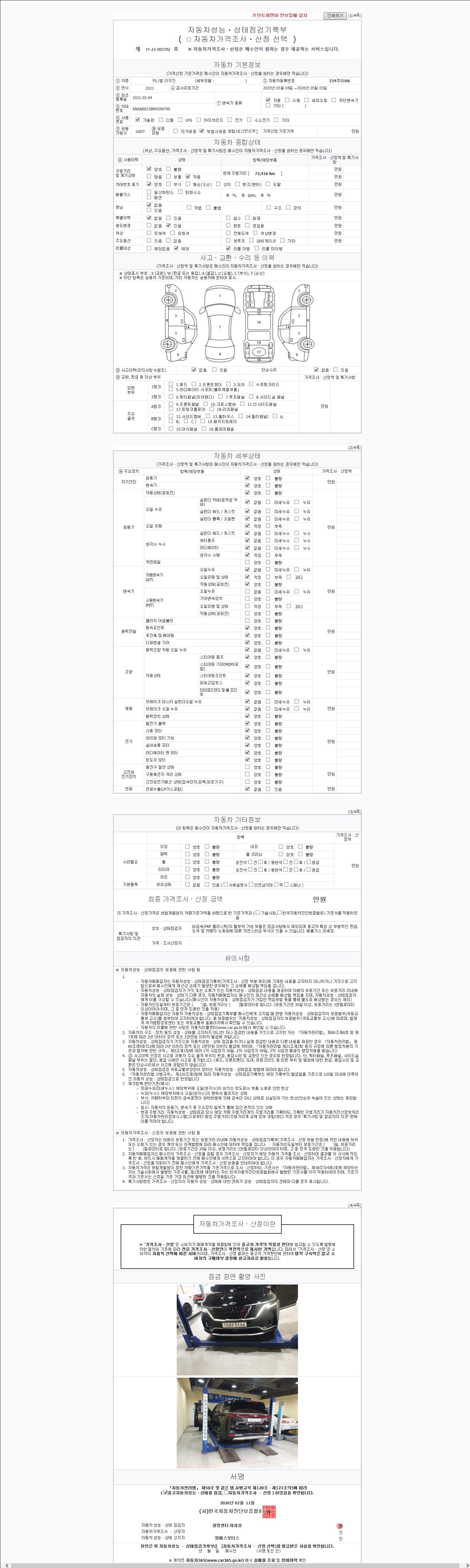 | 주행거리 | 72,200 km | 차량번호 | 154주5166 | 사고유무 | 성능기록부 참조 | 제시번호 | 제 2147483647 호 |