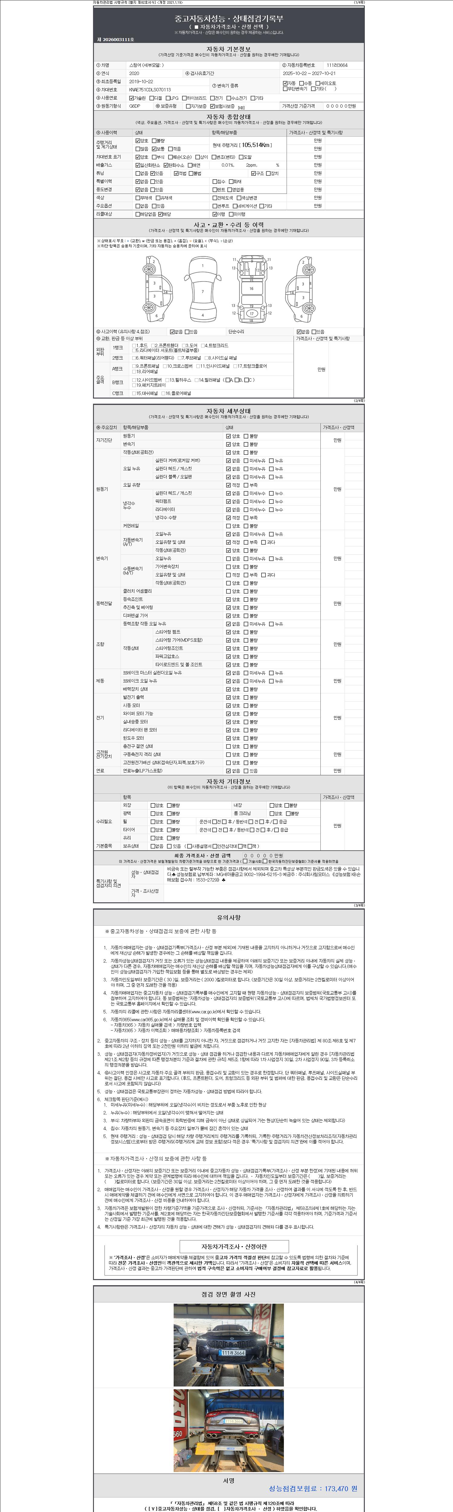 | 주행거리 | 105,514 km | 차량번호 | 111러3664 | 사고유무 | 성능기록부 참조 | 제시번호 | 제 2147483647 호 |