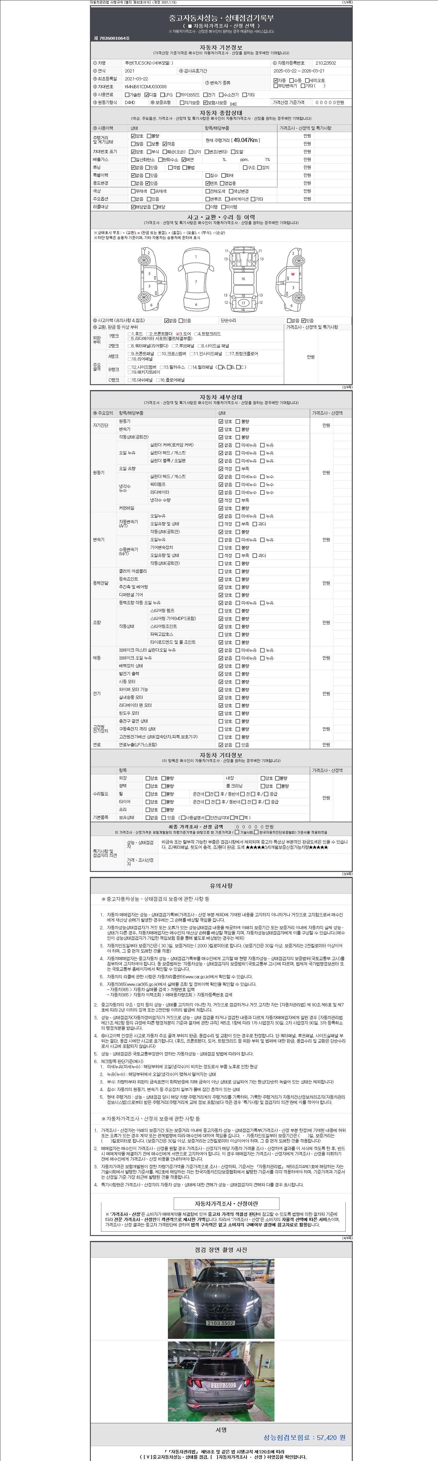 | 주행거리 | 49,047 km | 차량번호 | 210고3502 | 사고유무 | 성능기록부 참조 | 제시번호 | 제 2147483647 호 |