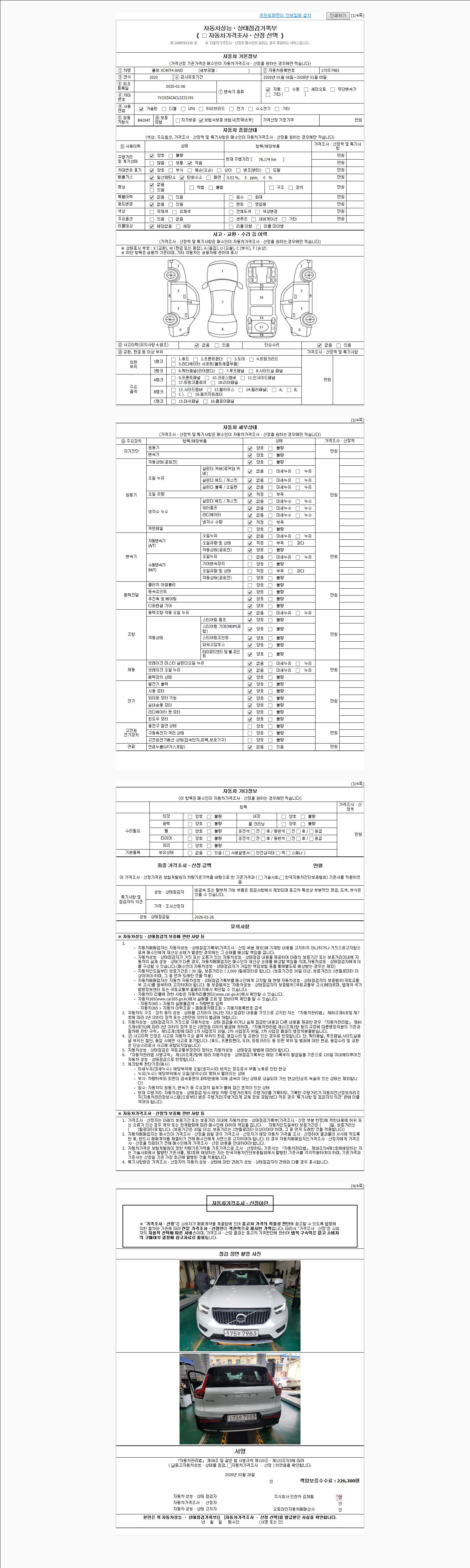 | 주행거리 | 78,174 km | 차량번호 | 175우7983 | 사고유무 | 성능기록부 참조 | 제시번호 | 제 2026009395 호 |