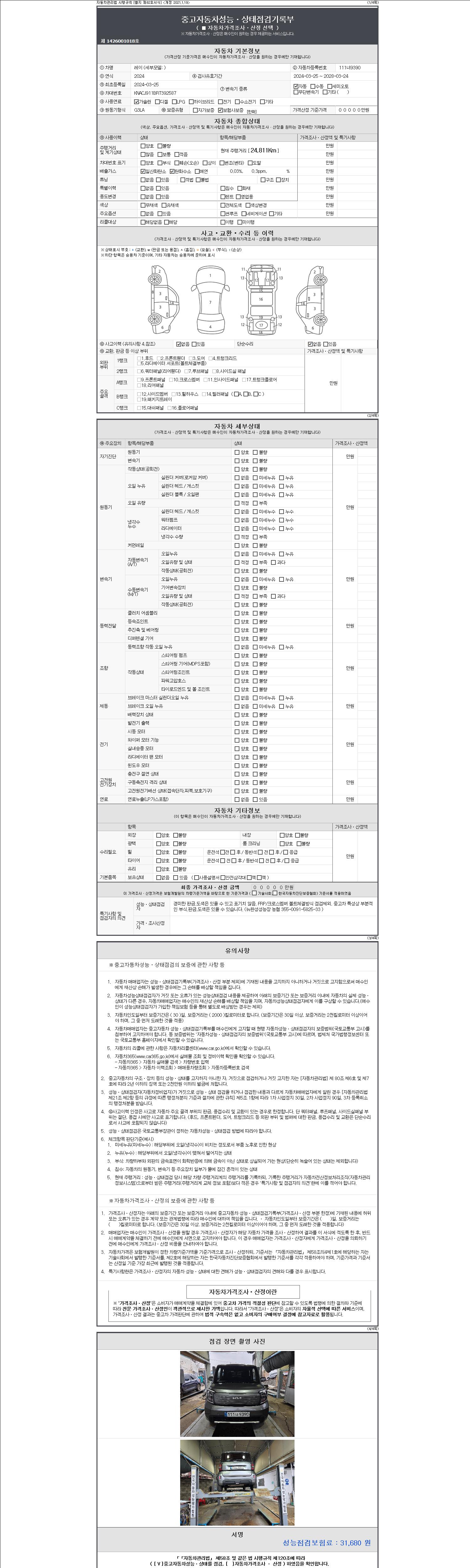 | 주행거리 | 24,811 km | 차량번호 | 111너9390 | 사고유무 | 성능기록부 참조 | 제시번호 | 제 2147483647 호 |