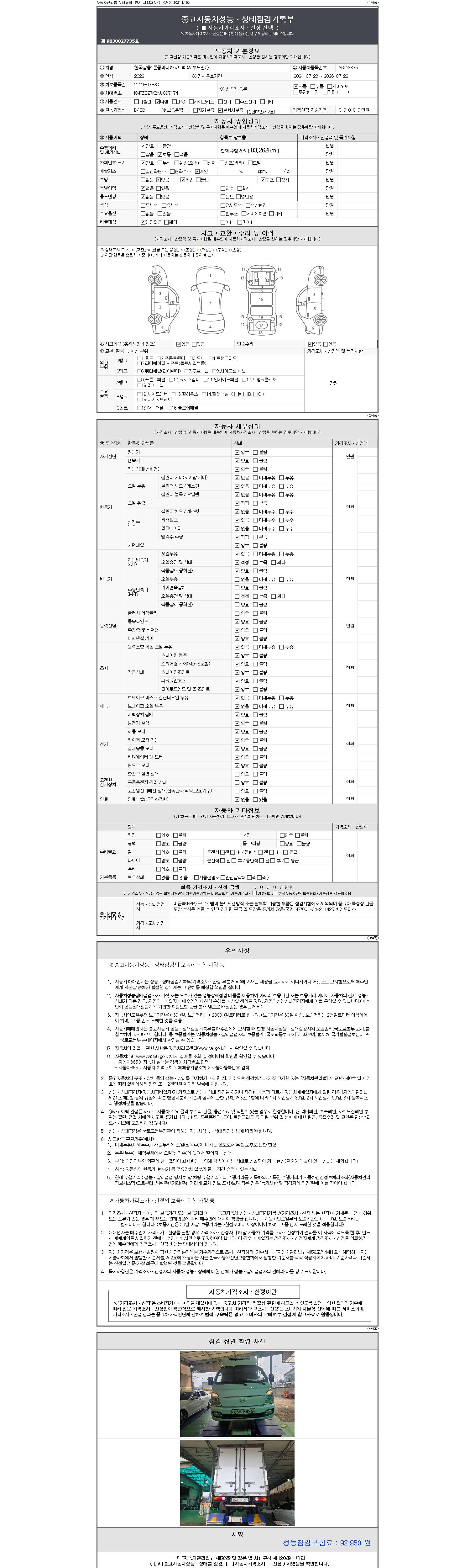 | 주행거리 | 83,262 km | 차량번호 | 86주8875 | 사고유무 | 성능기록부 참조 | 제시번호 | 제 2147483647 호 |