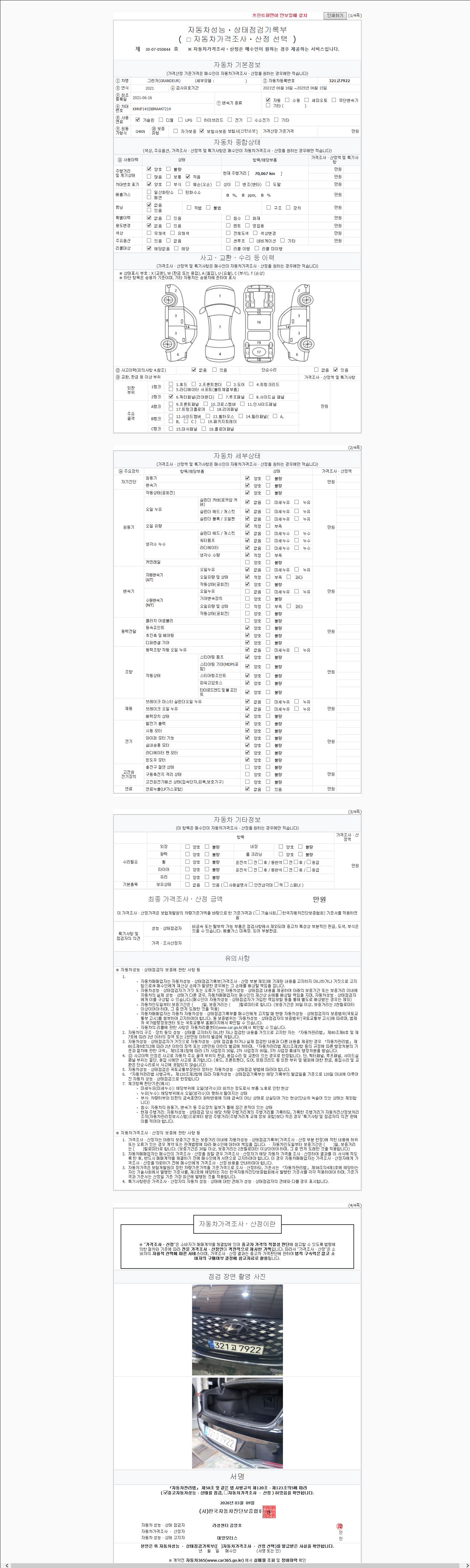 | 주행거리 | 70,067 km | 차량번호 | 321고7922 | 사고유무 | 성능기록부 참조 | 제시번호 | 제 2147483647 호 |