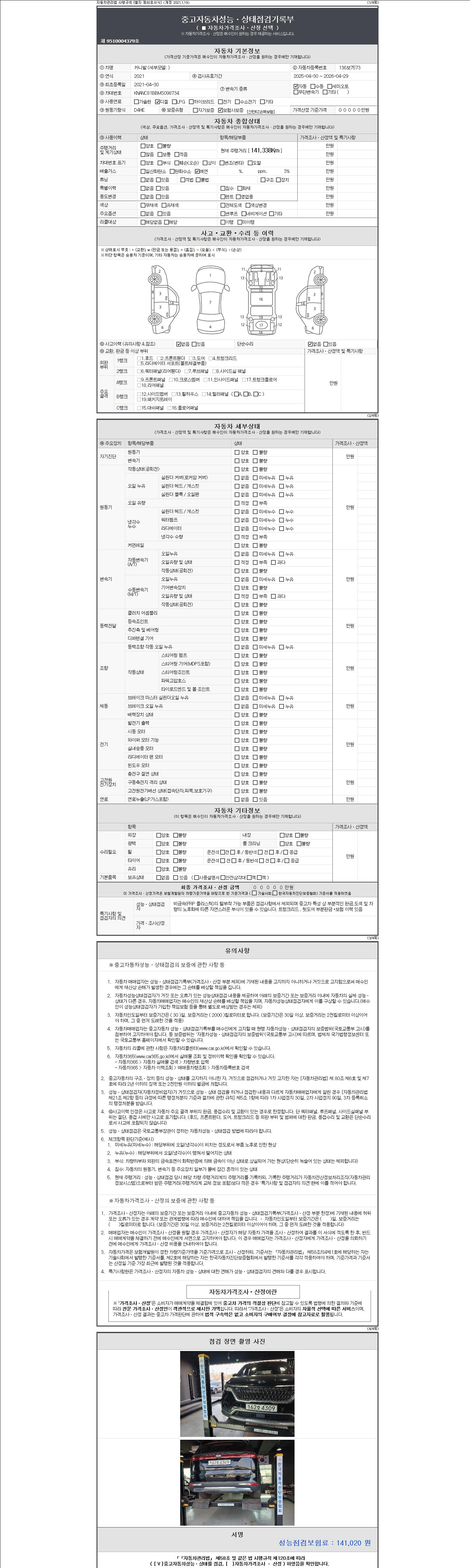 | 주행거리 | 141,000 km | 차량번호 | 136보7573 | 사고유무 | 성능기록부 참조 | 제시번호 | 제 2147483647 호 |