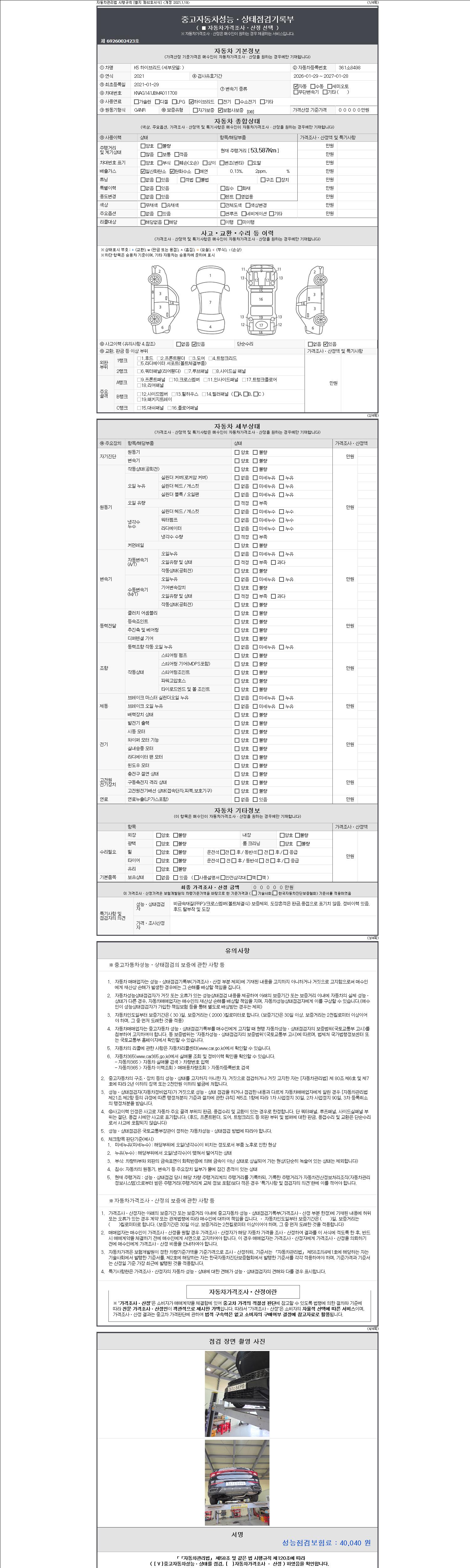자동차관리법 시행규칙 제120조의 규정에 따라 별지 제 82호서식 《중고자동차 성능, 상태점검 기록부》를 발행한 성능, 상태점검자 및 매매자는 아래의 보증기간 또는 보증거리 이내의 중고자동차, 성능점검 기록부에 기재된 내용과 자동차의 실제 성능, 상태가 다른 경우 계약 또는 관계법령에 따라 매수인에 대하여 책임을 집니다.
