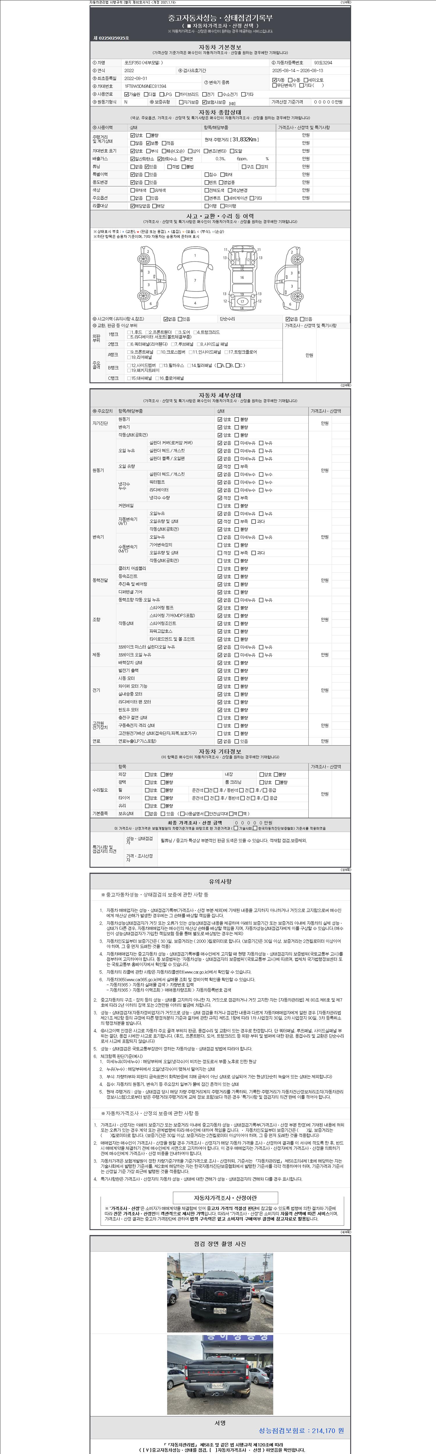| 주행거리 | 31,832 km | 차량번호 | 93도3294 | 사고유무 | 성능기록부 참조 | 제시번호 | 제 2147483647 호 |