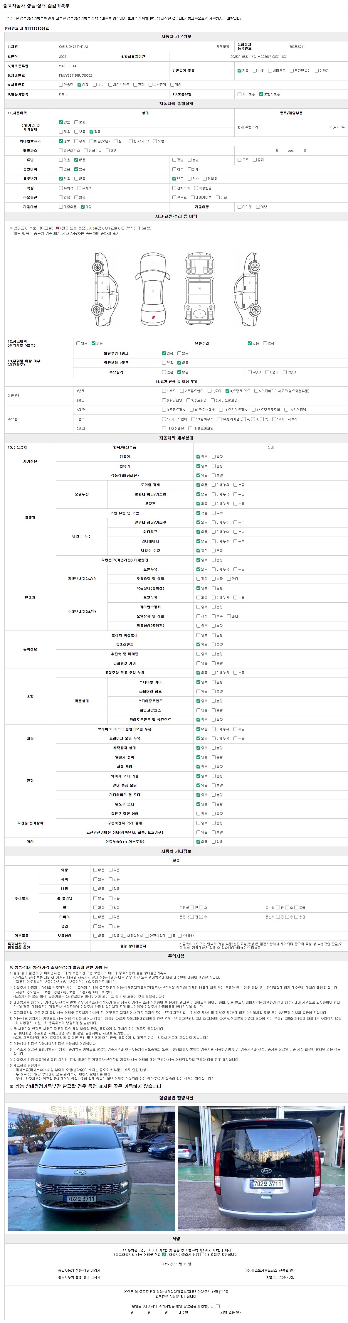 | 주행거리 | 23,462 km | 차량번호 | 702모3711 | 사고유무 | 성능기록부 참조 | 제시번호 | 제 2025038002 호 |