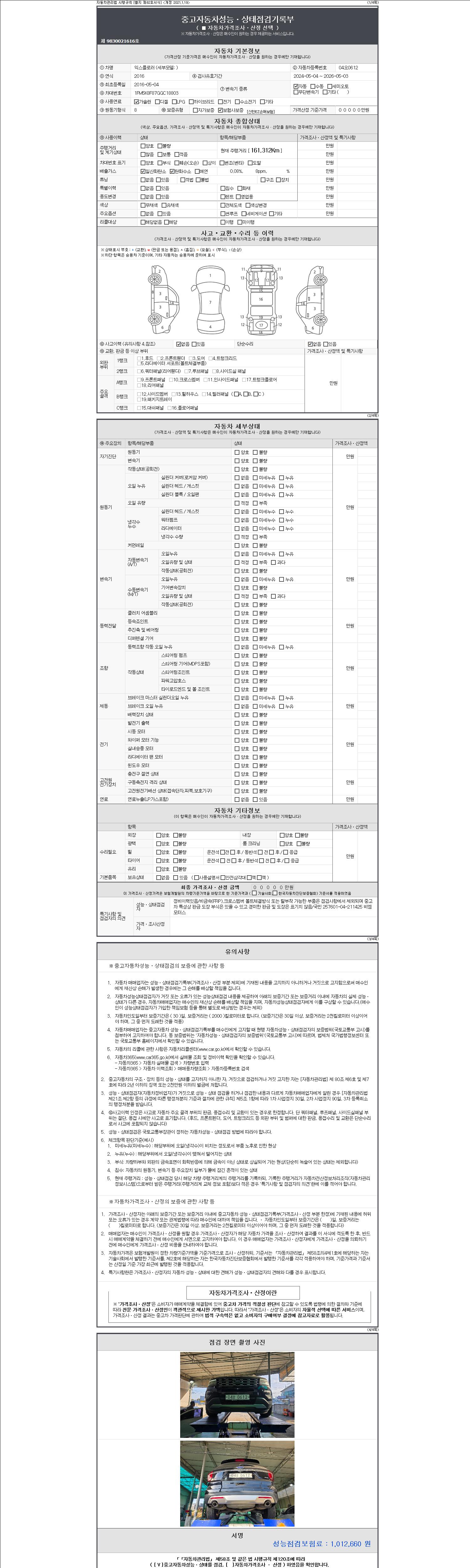 | 주행거리 | 161,312 km | 차량번호 | 04오0612 | 사고유무 | 성능기록부 참조 | 제시번호 | 제 2147483647 호 |