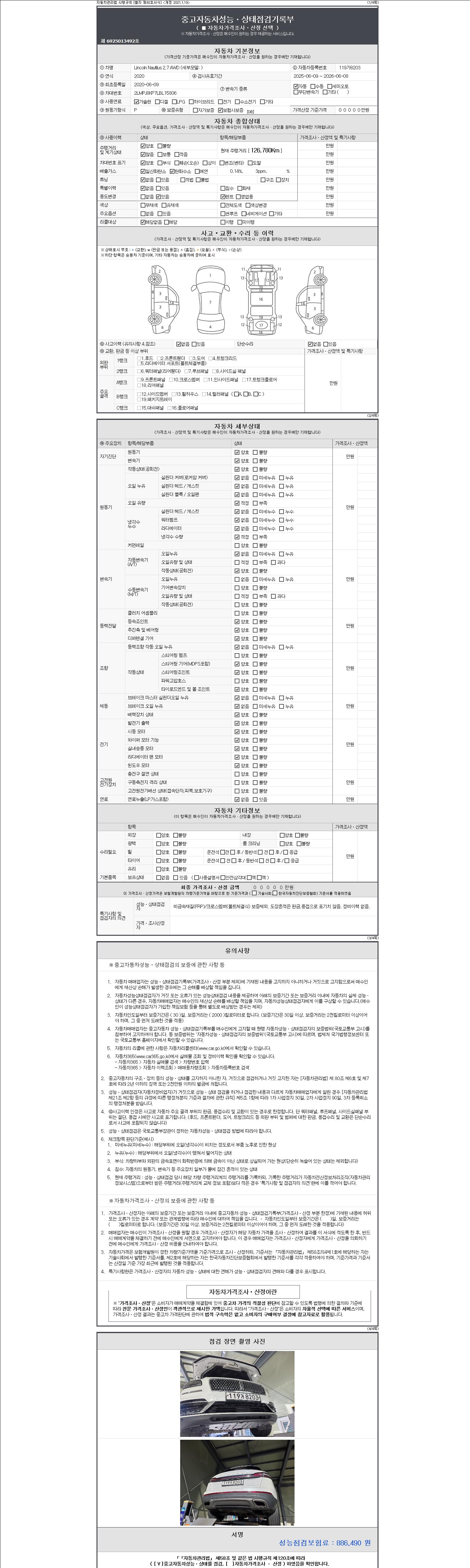 | 주행거리 | 126,484 km | 차량번호 | 119가8203 | 사고유무 | 성능기록부 참조 | 제시번호 | 제 2147483647 호 |