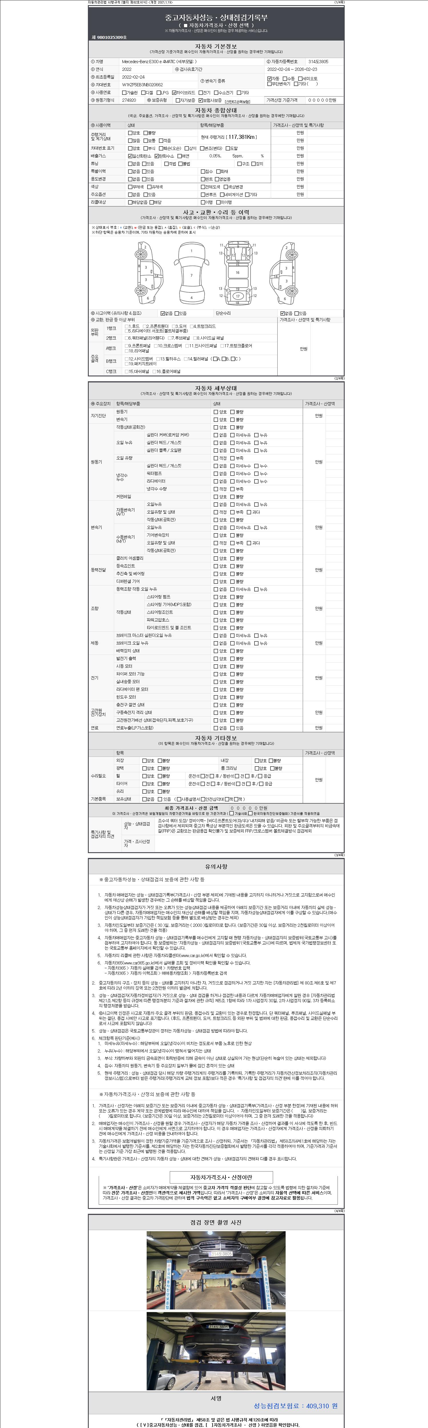 자동차관리법 시행규칙 제120조의 규정에 따라 별지 제 82호서식 《중고자동차 성능, 상태점검 기록부》를 발행한 성능, 상태점검자 및 매매자는 아래의 보증기간 또는 보증거리 이내의 중고자동차, 성능점검 기록부에 기재된 내용과 자동차의 실제 성능, 상태가 다른 경우 계약 또는 관계법령에 따라 매수인에 대하여 책임을 집니다.