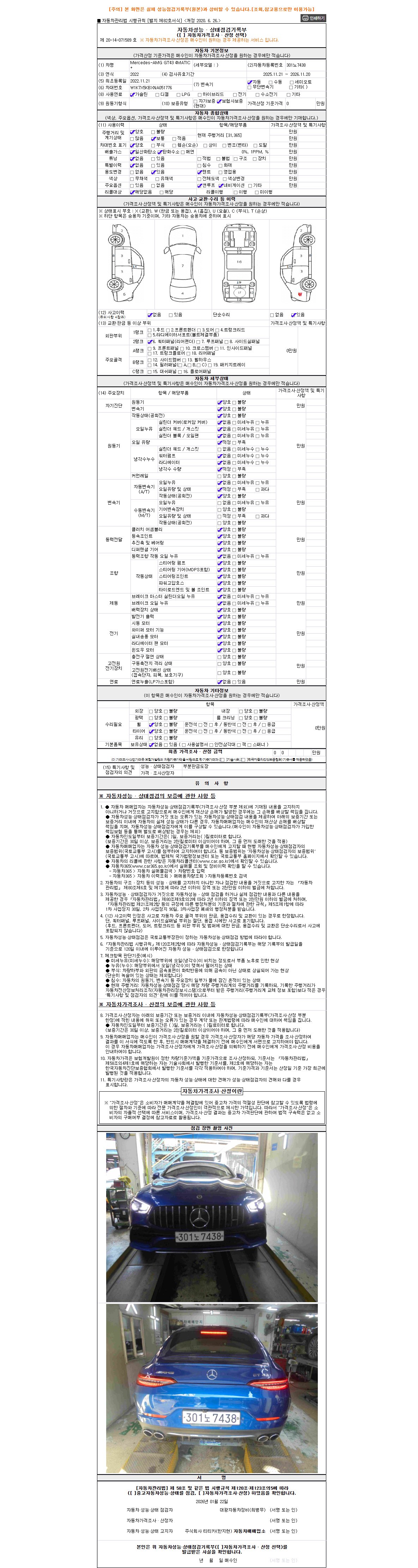 -중고자동차 매매업자를 통해 차량을 구입하실 경우 반드시 "중고자동차 성능, 상태점검 기록부"를 교뷰 받으셔야 하며, 매매업자는 반드시 의무 교부 하여야 압니다.