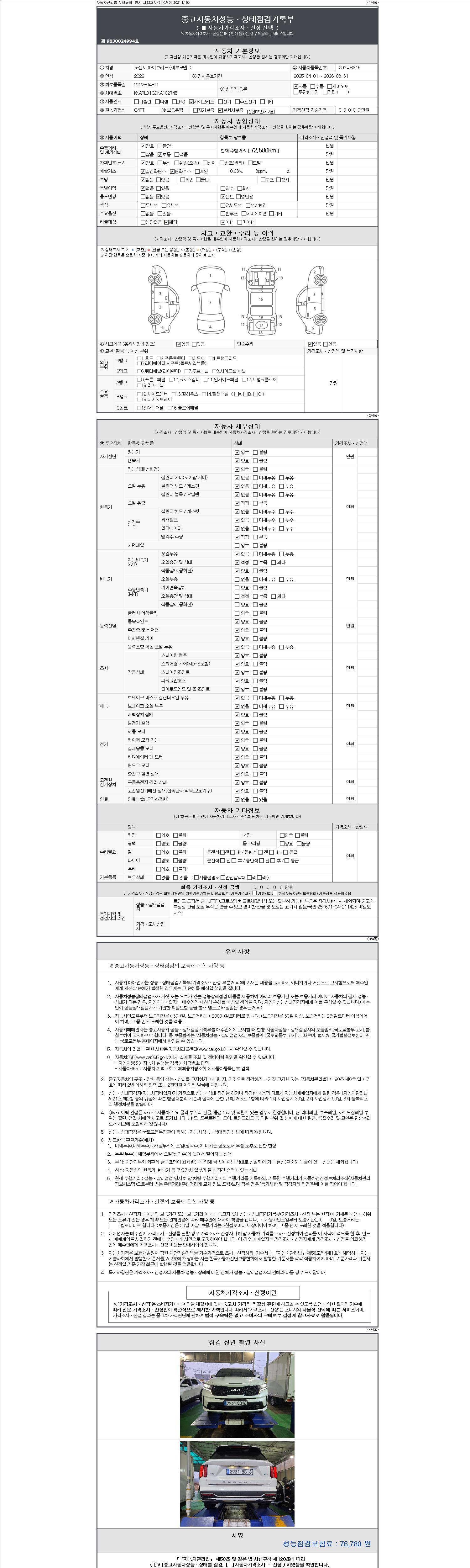 | 주행거리 | 72,580 km | 차량번호 | 293다8816 | 사고유무 | 성능기록부 참조 | 제시번호 | 제 2147483647 호 |