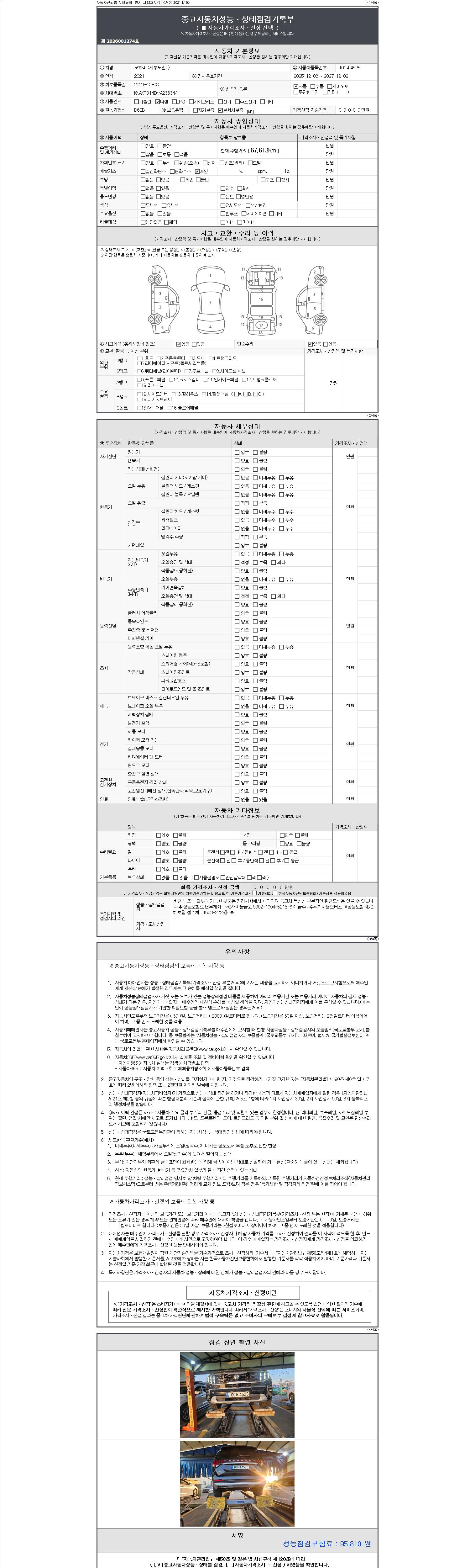 자동차관리법 시행규칙 제120조의 규정에 따라 별지 제 82호서식 《중고자동차 성능, 상태점검 기록부》를 발행한 성능, 상태점검자 및 매매자는 아래의 보증기간 또는 보증거리 이내의 중고자동차, 성능점검 기록부에 기재된 내용과 자동차의 실제 성능, 상태가 다른 경우 계약 또는 관계법령에 따라 매수인에 대하여 책임을 집니다.