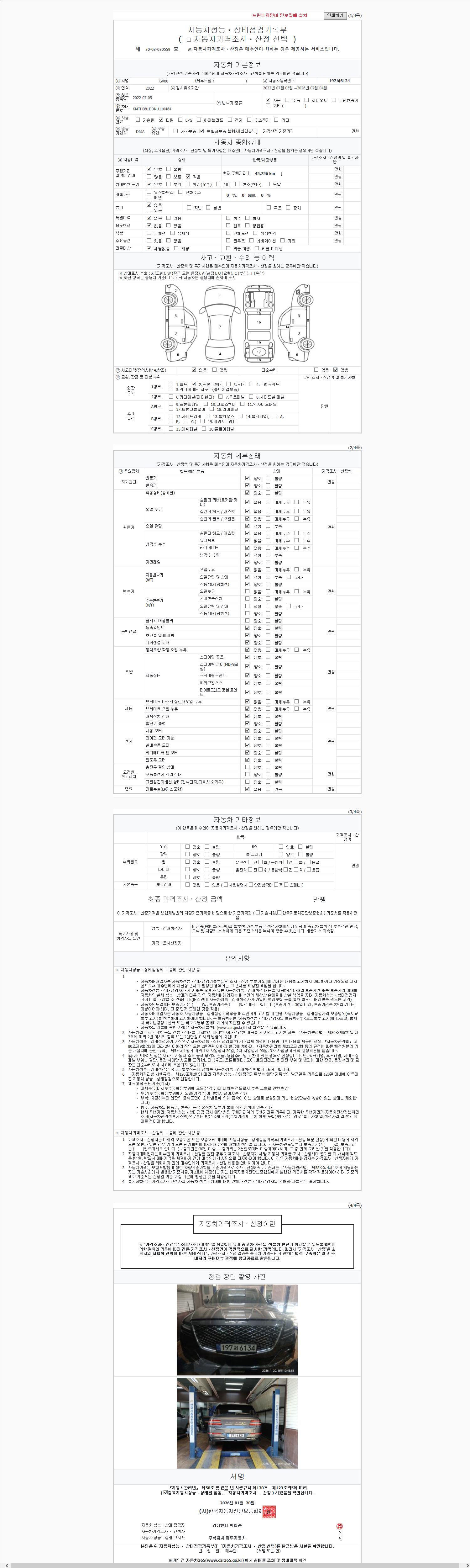 | 주행거리 | 45,756 km | 차량번호 | 197저6134 | 사고유무 | 성능기록부 참조 | 제시번호 | 제 2026007660 호 |