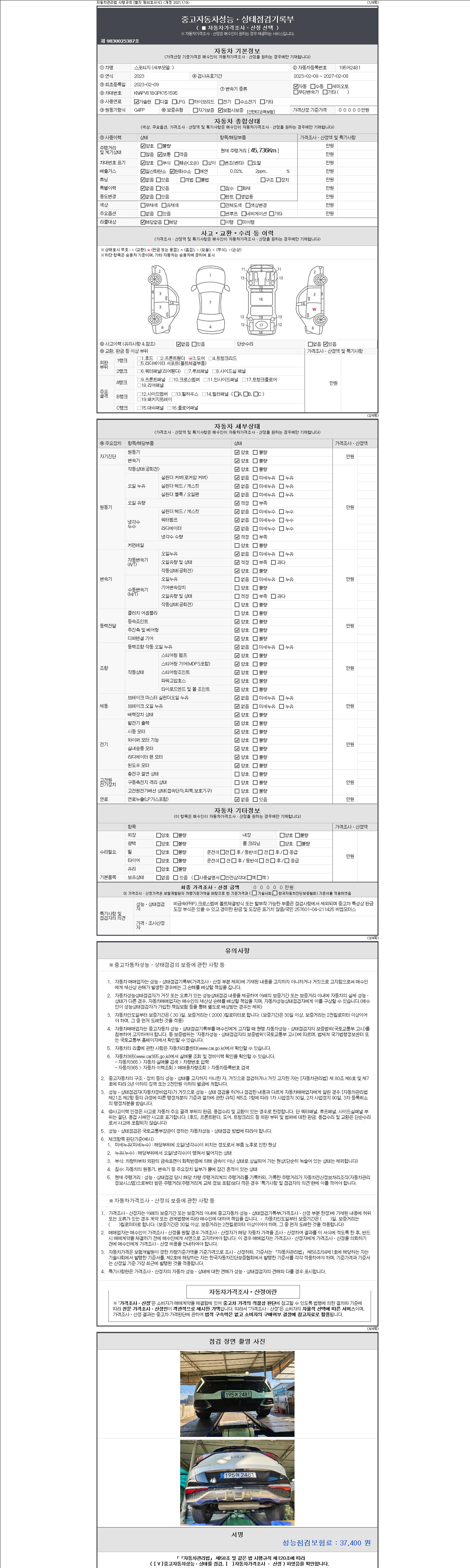 | 주행거리 | 45,736 km | 차량번호 | 195어2481 | 사고유무 | 성능기록부 참조 | 제시번호 | 제 2147483647 호 |