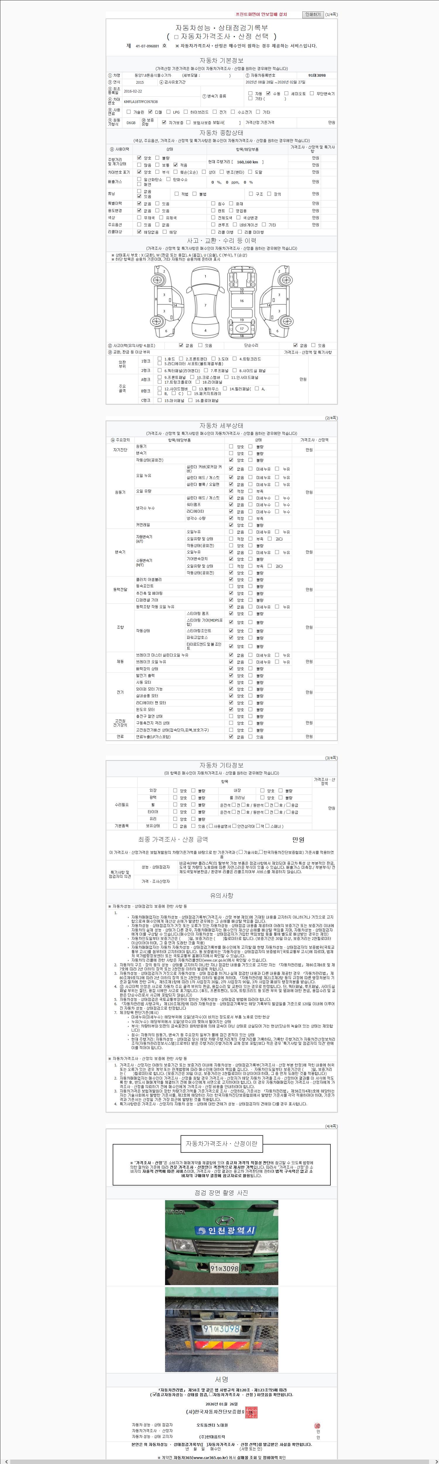 | 주행거리 | 160,000 km | 차량번호 | 91어3098 | 사고유무 | 성능기록부 참조 | 제시번호 | 제 2147483647 호 |