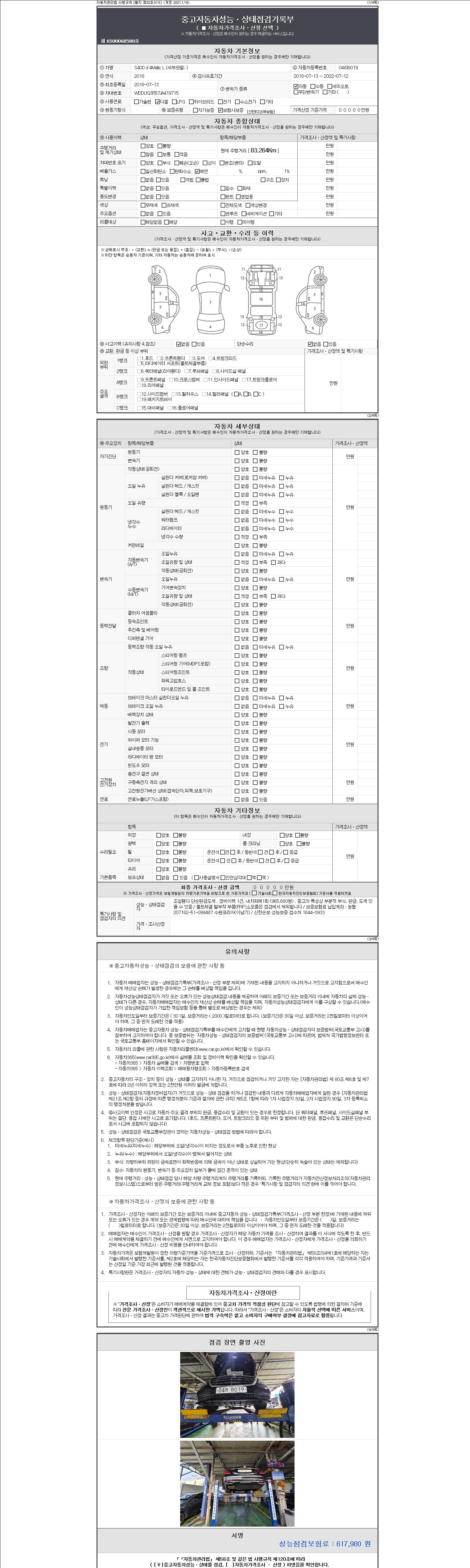 | 주행거리 | 83,264 km | 차량번호 | 04라8019 | 사고유무 | 성능기록부 참조 | 제시번호 | 제 2147483647 호 |