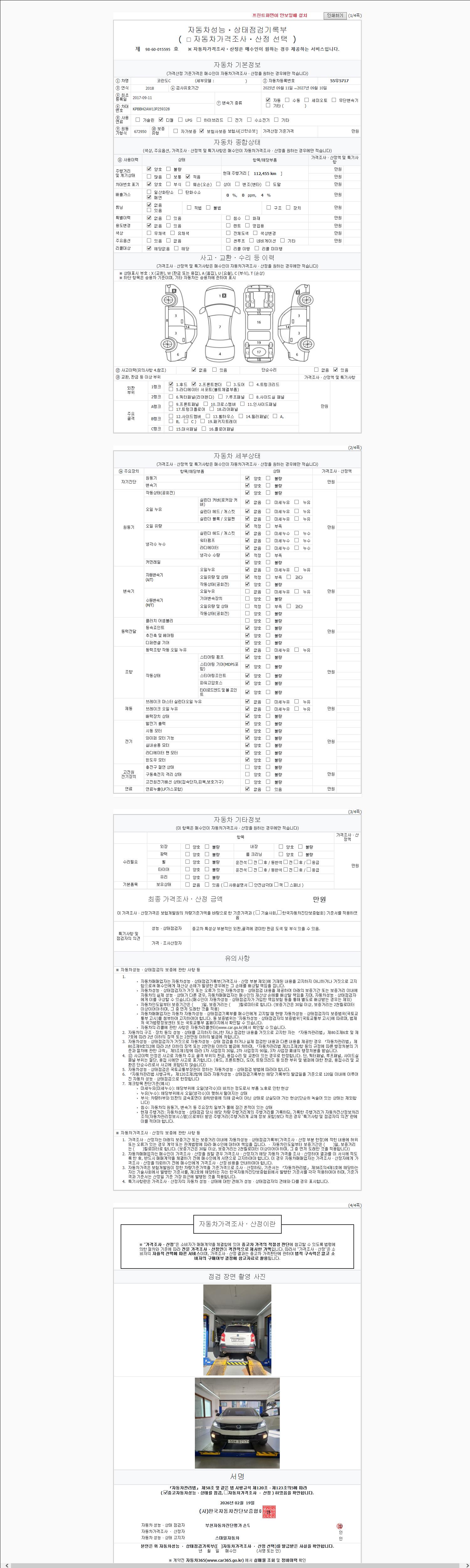 | 주행거리 | 112,048 km | 차량번호 | 55우5717 | 사고유무 | 성능기록부 참조 | 제시번호 | 제 2026029765 호 |