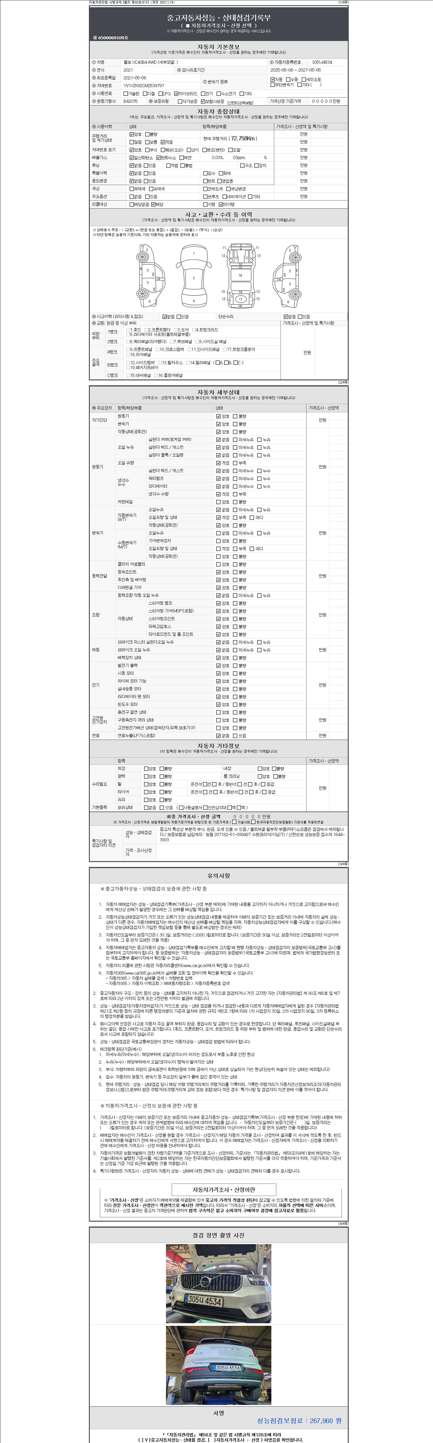 | 주행거리 | 72,758 km | 차량번호 | 305나4534 | 사고유무 | 성능기록부 참조 | 제시번호 | 제 2147483647 호 |