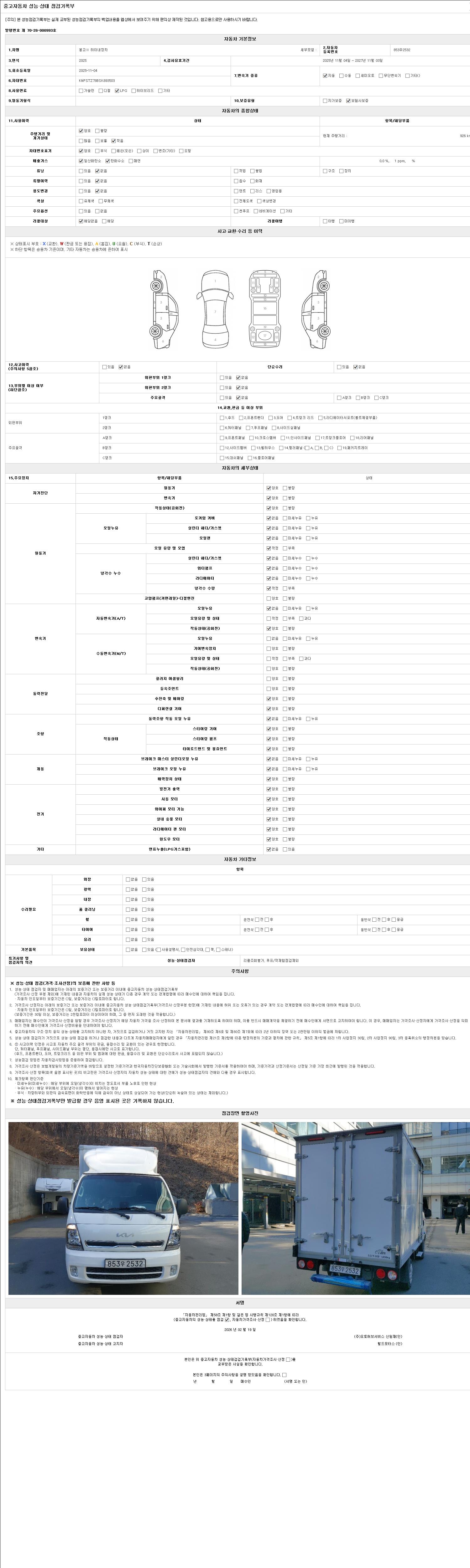 | 주행거리 | 926 km | 차량번호 | 853우2532 | 사고유무 | 성능기록부 참조 | 제시번호 | 제 2147483647 호 |