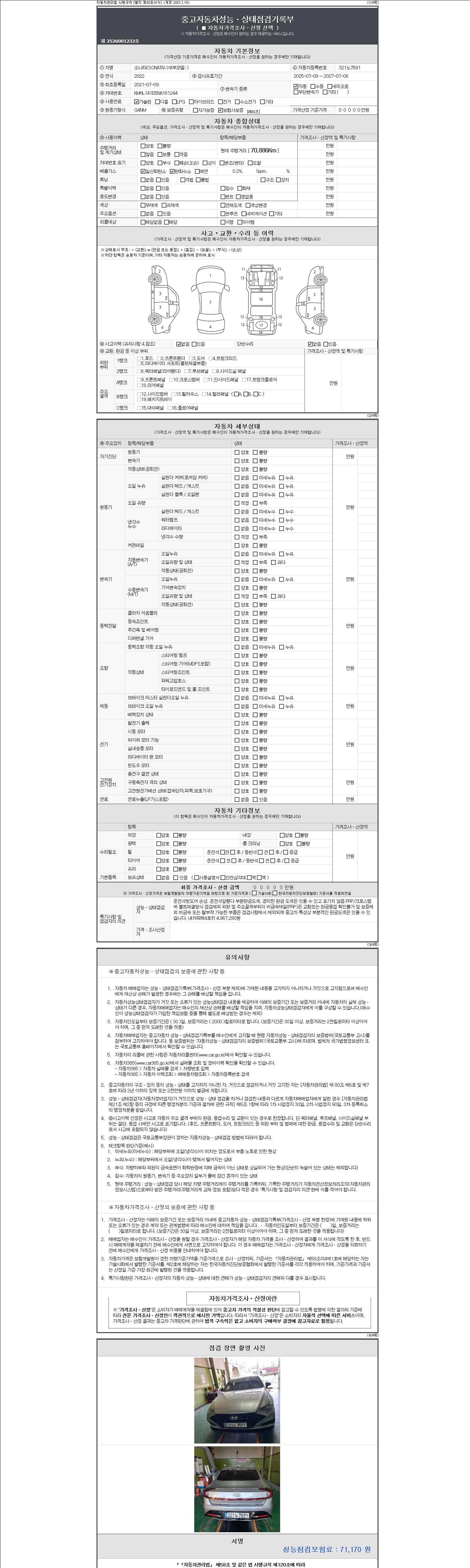 | 주행거리 | 70,830 km | 차량번호 | 321노7591 | 사고유무 | 성능기록부 참조 | 제시번호 | 제 2147483647 호 |