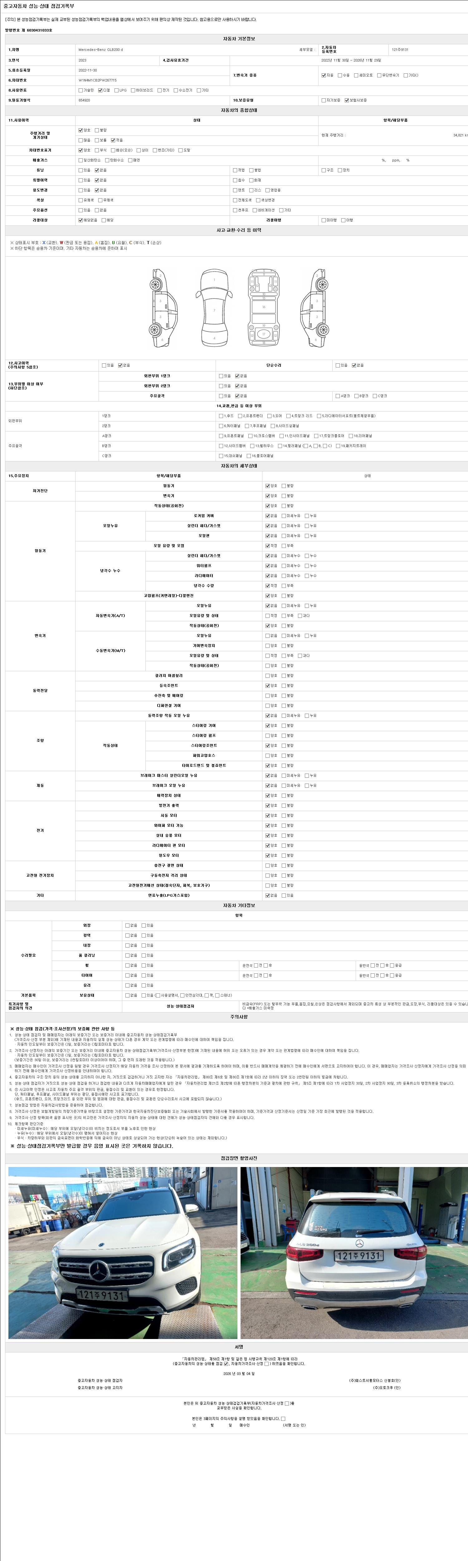 | 주행거리 | 34,821 km | 차량번호 | 121주9131 | 사고유무 | 성능기록부 참조 | 제시번호 | 제 2026006931 호 |