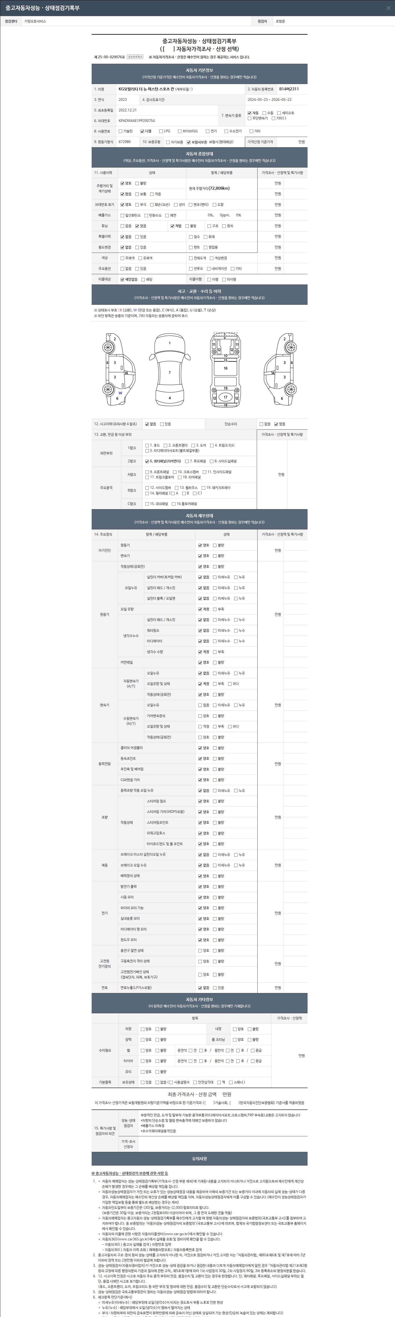 - 2. 차량 등록증이나 성능점검지 등을 상담자에게 요청및 확인하시고 사전에 미리 점검 하시기를 권유드립니다.