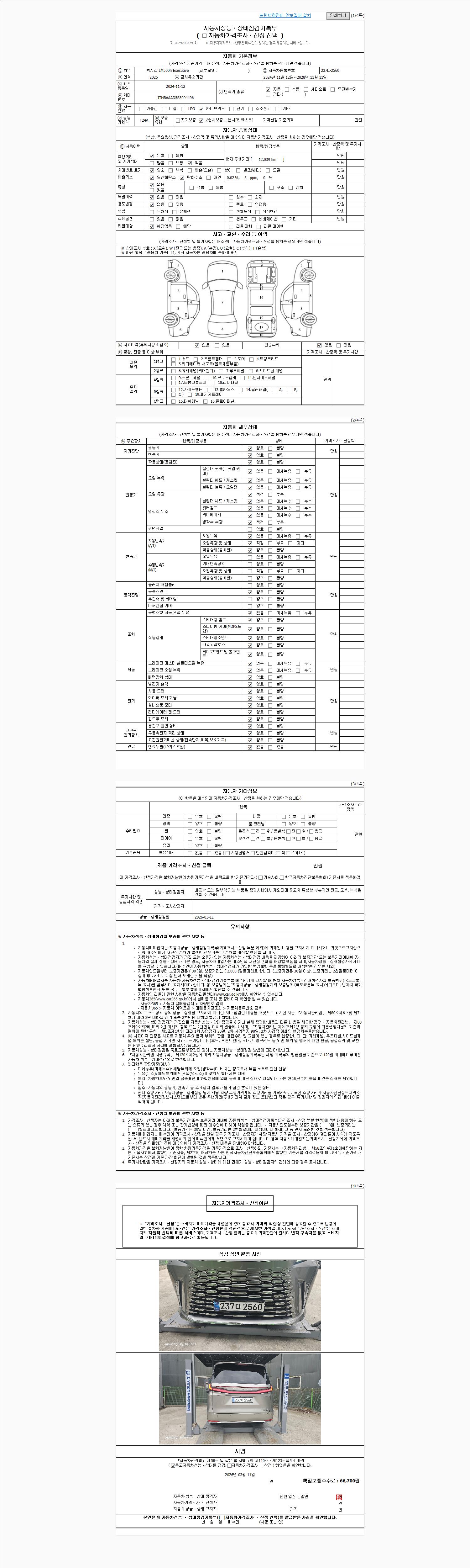 | 주행거리 | 12,037 km | 차량번호 | 237다2560 | 사고유무 | 성능기록부 참조 | 제시번호 | 제 2026012541 호 |