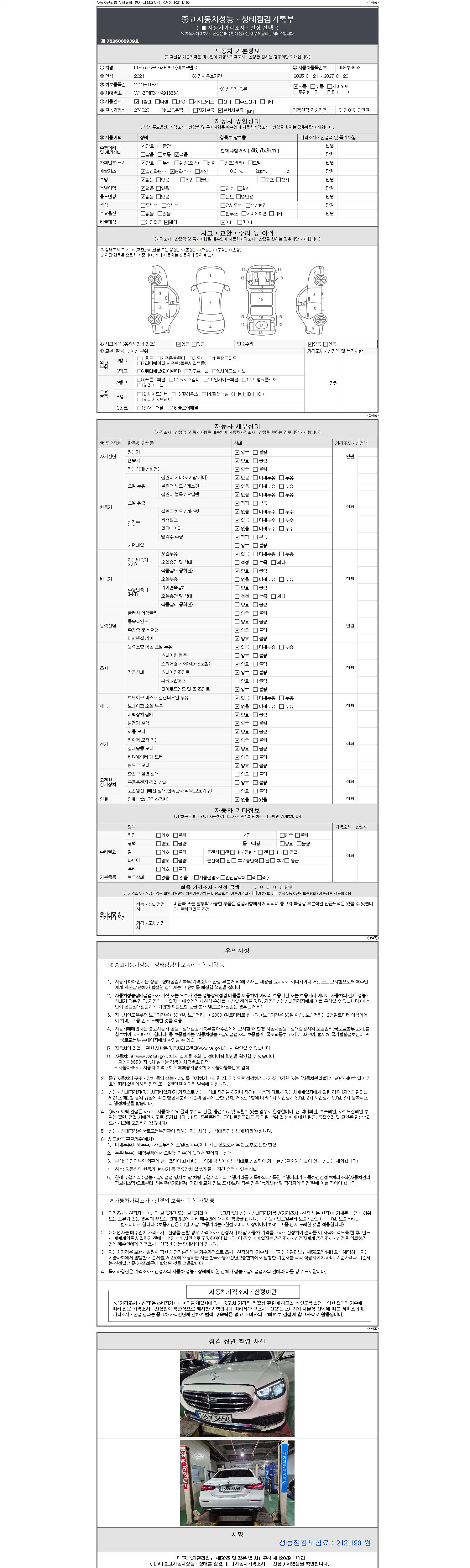 | 주행거리 | 46,753 km | 차량번호 | 165부3658 | 사고유무 | 성능기록부 참조 | 제시번호 | 제 2147483647 호 |
